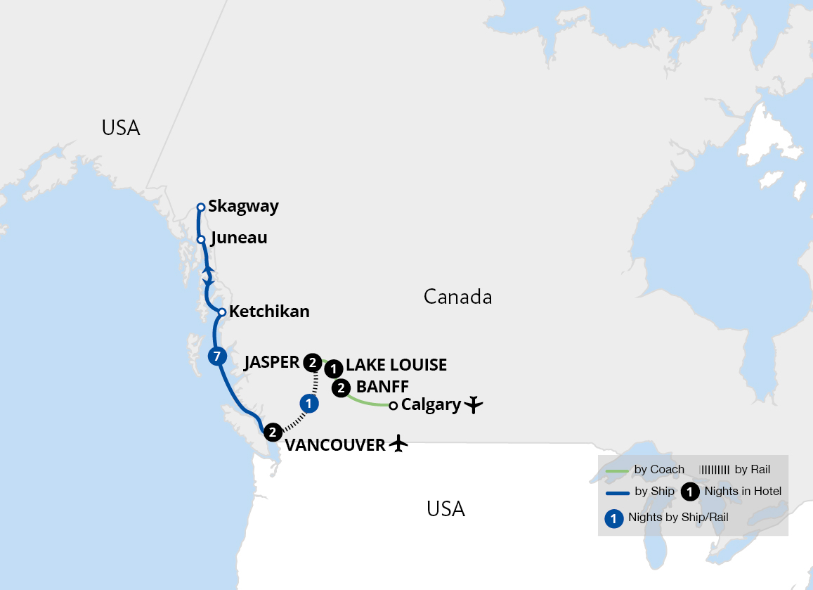 On this once-in-a-lifetime tour you'll begin by exploring the alpine resort towns of Banff, Lake Louise, and Jasper, before boarding VIA Rail's Canadian train for a trip through the Canadian Rockies to Vancouver. After exploring the exciting city of Vancouver, you'll swap the rails for the waterways when you board your cruise ship to take you...