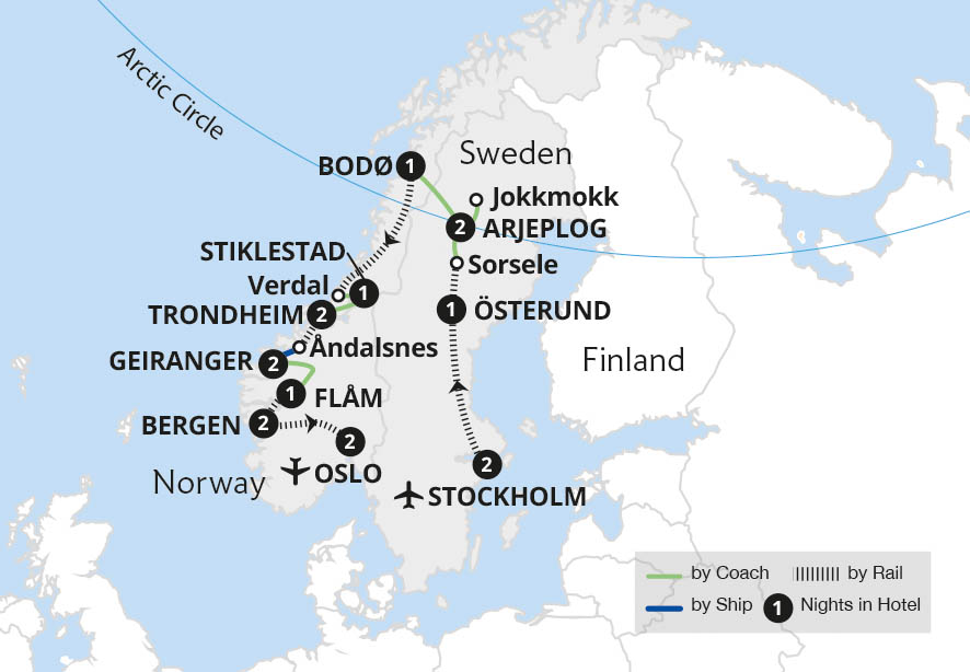 Join us on a summertime journey across the length of Norway - from Oslo to the Arctic Circle. Travel on four of the country's world-renowned rail routes, the Flåm, Bergen, Nordland and Rauma railways and cruise across the Geirangerfjord, discovering otherworldly landscapes. On this top-rated tour of Norway's beautiful cities and the arctic...