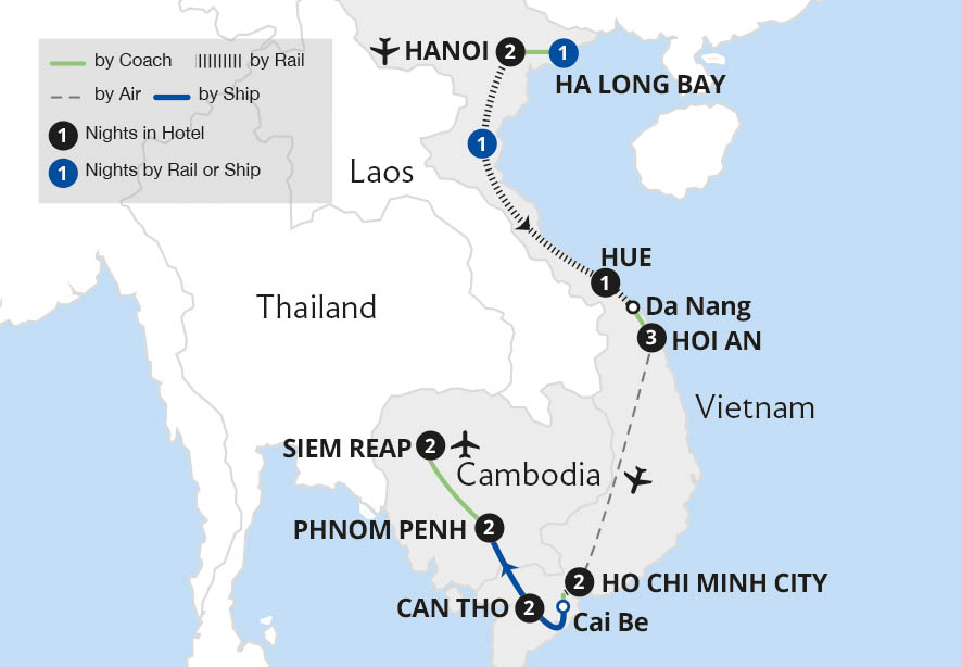 Discover the delights of Vietnam and Cambodia on this incredible grand tour, travelling from bustling Hanoi to the ancient temples of Siem Reap. Delight in the beauty of Ha Long Bay on an overnight cruise, and ride in a Violette cabin aboard the Reunification Express train along Vietnam's coast, visiting regal Hue and pretty Hoi An before...