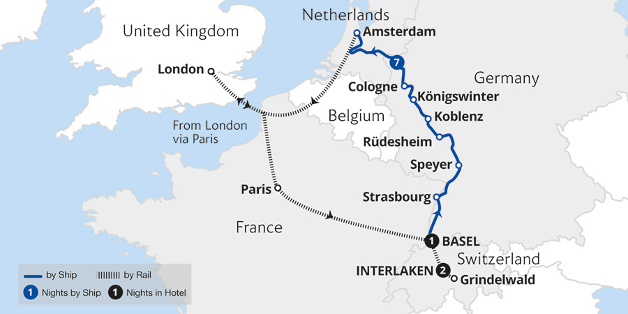 Combine an iconic rail trip on the Jungfrau Railway to the 'Top of Europe' from the alpine resort town of Interlaken with a 7-night luxury cruise through the glorious Moselle and Rhine. From Interlaken's stunning lake and mountain setting, we board the MS Amadeus Cara, and cruise two of Europe's celebrated rivers - the meandering Moselle...